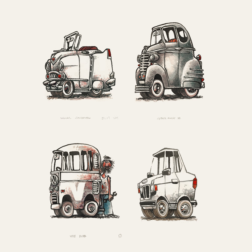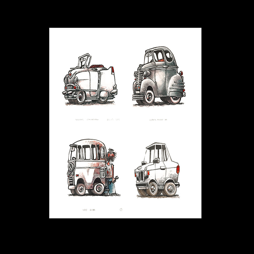 The third - the VW Bus, 1966 - the ultimate simple car, roomy enough for hippies and more, able to traverse the entire country in a roving party. The righteous reaction against the bourgeoise cadillac.